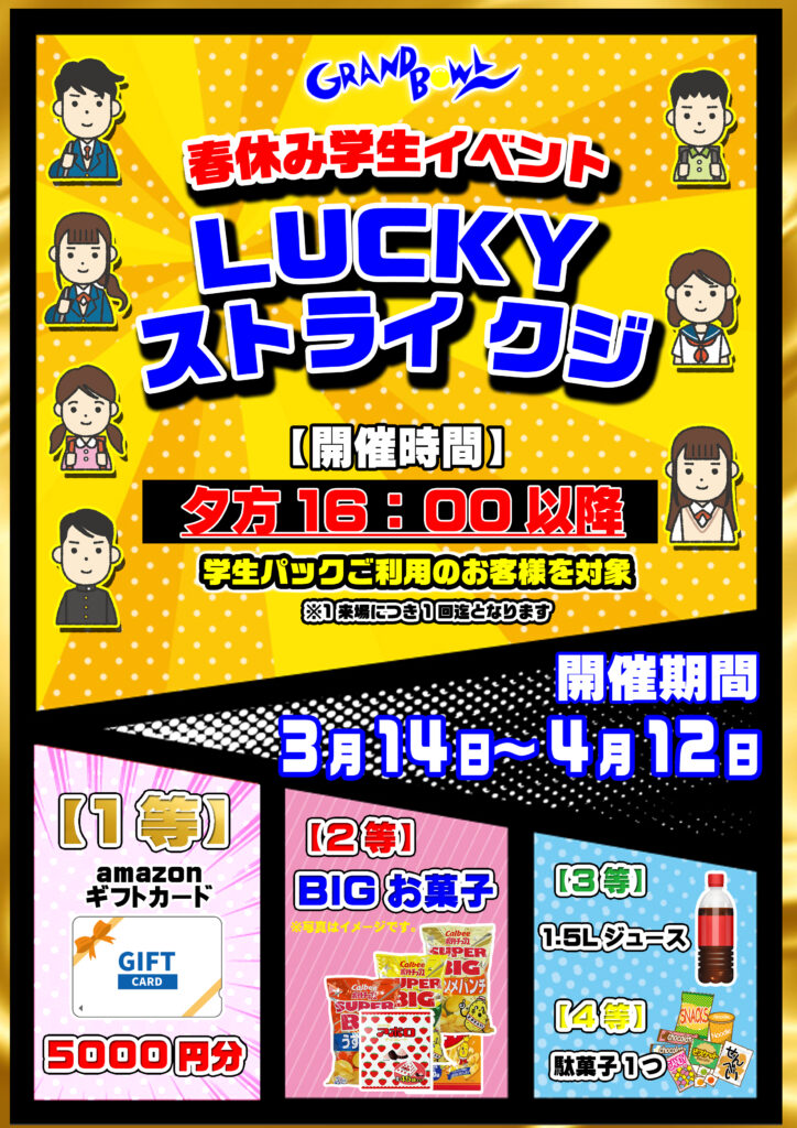 学生イベント LUCKYストライクジ 3月14日(土)からスタート(16時以降にご来場者対象)