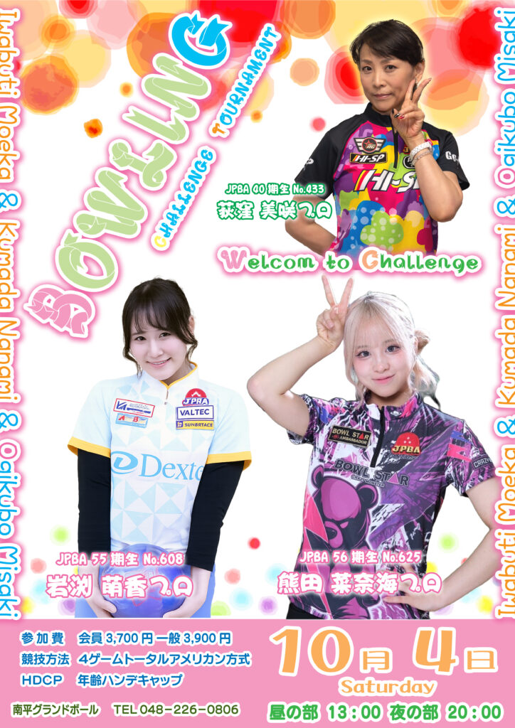 2025年09月22日 10月4日(土)岩渕萌香プロ・熊田菜奈海プロ・荻窪 美咲プロチャレンジ開催 南平クランドボールにて 岩渕萌香プロ・熊田菜奈海プロ・荻窪美咲プロチャレンジを開催♪♪ 開催日は10月4日の土曜日 スタート時間 昼の部13:00 夜の部 20:00 参加費 4ゲーム 会員 3,700円 (一般参加+200円) 皆さまのご参加をお待ちしております(*^^)v